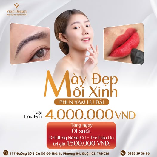Bạn muốn sở hữu đôi chân mày sắc nét và đôi môi hồng hào tự nhiên mà không tốn nhiều thời gian kẻ vẽ mỗi ngày? Vian Beauty mang đến cơ hội trải nghiệm dịch vụ phun xăm thẩm mỹ chuyên nghiệp với chương trình ưu đãi hấp dẫn, giúp bạn vừa làm đẹp vừa nhận quà giá trị.